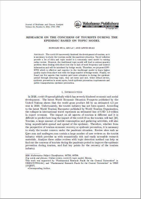 Covid-19对全球旅游业带了巨大的冲击,根据世界旅游组织发布的数据,仅2020年,受新冠疫情影响,全球旅游市场规模缩减就超过了1.3万亿美元。在疫情背景下,游客在做预定、目的地选择等决策时到底关注什么?对这一问题的研究既有利于疫情时期旅游业的维持也有助于后疫情时代旅游业的恢复。tripadvisor、马蜂窝等在线旅游社区蕴含大量的评论、游记和攻略等用户生成数据,它们是分析用户关注点的重要资料。本文爬取了大量旅游社区涉疫用户生成数据,在经典主题模型——BTM的基础上进行改进,使其更适合互联网短文本挖掘。文中提出方法被应用于爬取下来的大量用户生成数据的主题识别任务,最终发现疫情期间游客关注的热门话题。论文工作为疫情期间相关企业的运维管理、旅游目的地政策制定、防疫漏洞发现提供了重要参考,也为后疫情时代旅游业的恢复提供了思路。